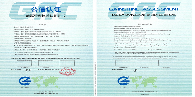 近日,经国家认监委批准,浙江传化化学集团有限公司正式取得了ISO50001:218能源管理体系认证证书,成为国内纺织印染行业首批获得能源管理体系认证的单位,给纺织印染行业的绿色发展构建了“新样板”。